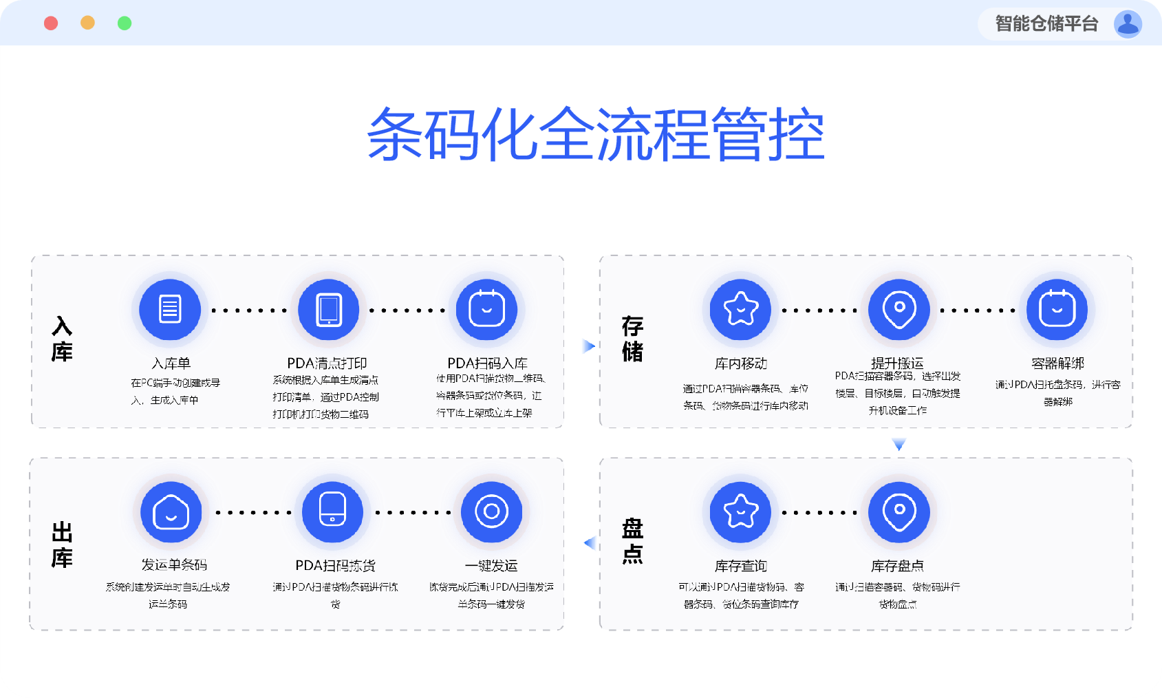 条码化全流程管控,制定货物专属条码规则,覆盖 “入库 - 存储 -盘点- 出库” 全环节,PDA 实时扫描采集数据,解决人工输入效率低、准确率低痛点,根治精确度难题。